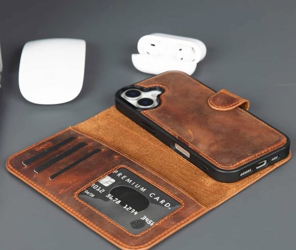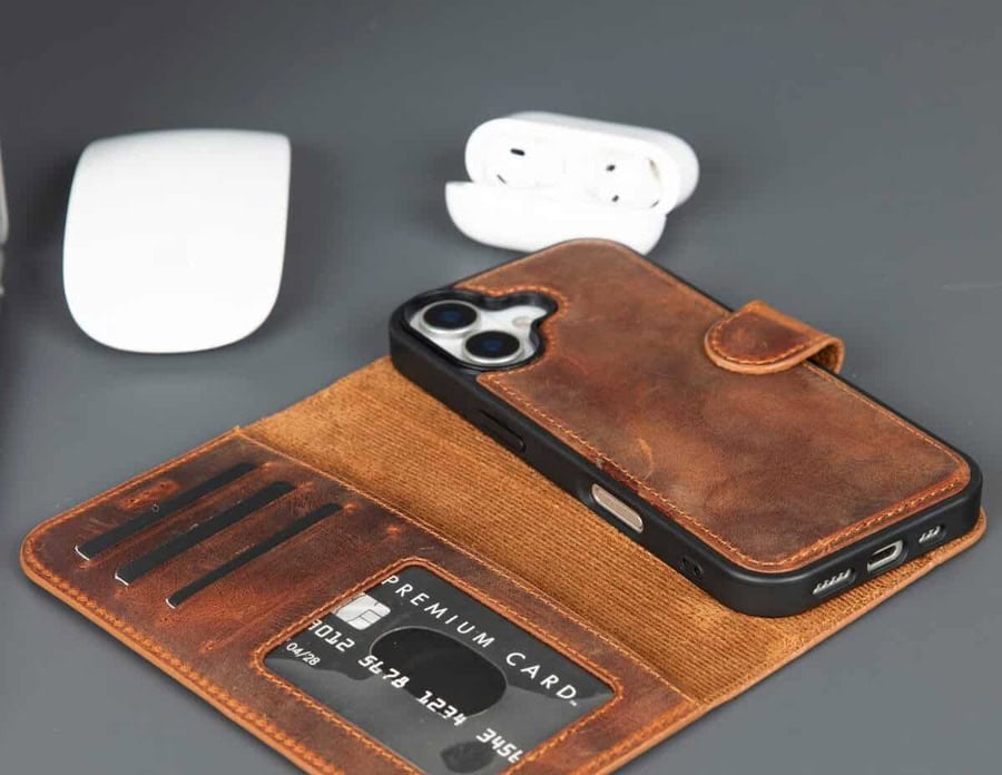 The TORONATA Casper iPhone 17 leather wallet case offers a refined blend of style, protection, and functionality. Handcrafted from premium full-grain leather, this elegant wallet case is tailored for the 6.1-inch iPhone 17, ensuring a perfect fit with a slim and durable profile. Equipped with four card slots—including a transparent ID window—and RFID-blocking technology, it keeps your essentials secure and organized. Designed for modern convenience, this iPhone 17 wallet case features a detachable MagSafe-compatible back cover and a built-in kickstand for hands-free video calls and entertainment.